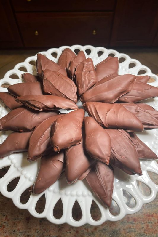 Neapolitan Mustazzoli (also called Mostaccioli) are iconic holiday cookies from Naples. They are rhombus-shaped treats made with flour, sugar, cocoa, honey, and warm spices such as cinnamon, cloves, and nutmeg. The dough is often enriched with almonds or other nuts, citrus zest, and sometimes candied fruit. Once baked, the cookies are coated in a layer of dark chocolate glaze, giving them a festive look and a rich flavor. Their name derives from “mustacc,” meaning mustache, due to their shape. These cookies are deeply tied to Neapolitan Christmas traditions and are enjoyed alongside other seasonal sweets like struffoli and roccocò.
